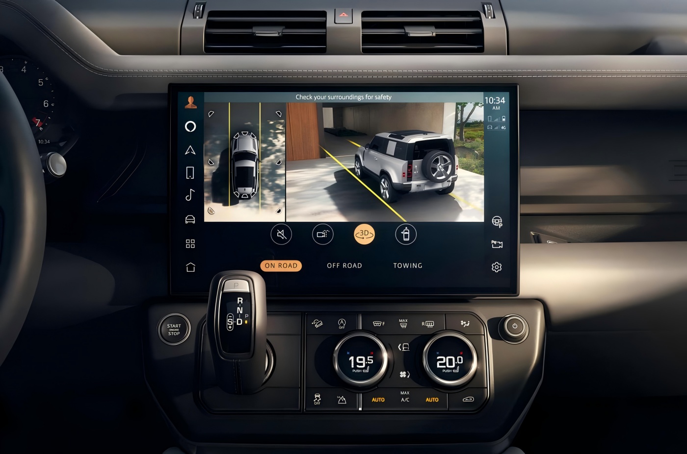 Belső. A belső tér szempontjából az új jármű általános elrendezése nem változott sokat. Még mindig van egy teljes folyadékkristályos műszerfal és egy háromkerekű többfunkciós kormánykerék. A középső konzol közepén lévő multimédiás kijelzőt 11,4 hüvelykről 13,1 hüvelykre frissítették. Eközben az új jármű hozzáadott egy vezető megfigyelő rendszert. Ez a megfigyelő rendszer megfelel az EU GSR2 előírásainak. Ha a sofőr észlelése nem figyel az előző útra, akkor audio- és video -riasztásokat vált ki. Az illesztőprogram segítségnyújtása azonban letiltható a középkonzol képernyőjén található opciókban. Ezen túlmenően a Land Rover adaptív terepjáró hajóutakozó rendszerét szintén először kínálják a Land Rover Defender-en, mint opcionális funkciót.